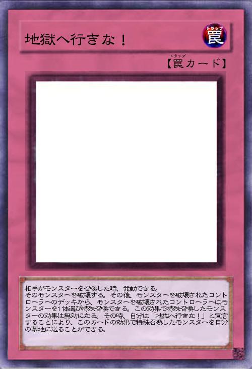 相手がモンスターを召喚した時、発動できる。 そのモンスターを破壊する。その後、モンスターを破壊されたコントローラーのデッキから、モンスターを破壊されたコントローラーはモンスターを1体選び特殊召喚できる。この効果で特殊召喚したモンスターの効果は無効になる。その時、自分は「地獄へ行きな!」と宣言することにより、このカードの効果で特殊召喚したモンスターを自分の墓地に送ることができる。 |