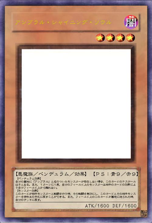 【ペンデュラム効果】 自分の墓地に「アンブラル」と名のついたモンスターが存在しない場合、このカードのPスケールは5となる。また、1ターンに1度、自分のフィールド上のモンスターは相手のカードの効果により自分フィールド上から離れない。 【モンスター効果】 このカードが相手モンスターと戦闘を行う時、その戦闘を無効にし、このカードとその相手モンスターを持ち主の手札に戻すことができる。また、フィールド上のこのカードが墓地に送られた時、自分のデッキに戻す。 |