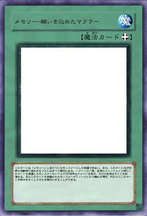 | このカードは「メモリー」と名のついたモンスターにしか装備できない。また、このカード及び効果の発動時に発生するコストはすべて無効になる。一ターンに一度、自身のメインフェイズ時にこのカードを装備したモンスターのレベル×100相手はダメージを受け、その分自身はライフを回復する。またこのカードを装備されたモンスターがフィールドから離れる場合、代わりにこのカードを除外することでそれを無効にすることができる。 | |||