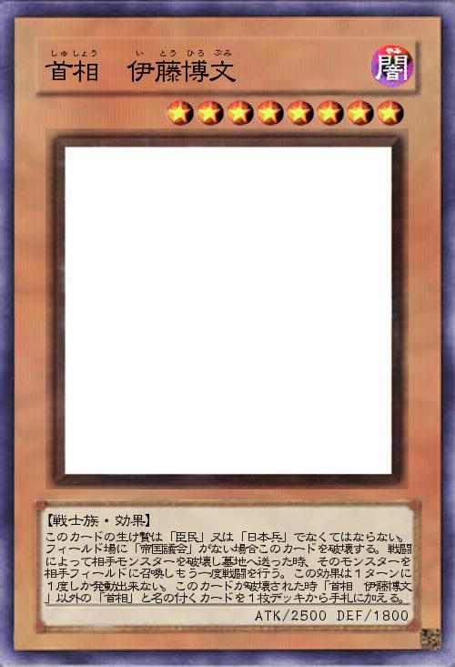 | このカードの生け贄は「臣民」又は「日本兵」でなくてはならない。フィールド場に「帝国議会」がない場合このカードを破壊する。戦闘によって相手モンスターを破壊し墓地へ送った時、そのモンスターを相手フィールドに召喚しもう一度戦闘を行う。この効果は1ターンに1度しか発動出来ない。このカードが破壊された時「首相 伊藤博文」以外の「首相」と名の付くカードを1枚デッキから手札に加える。 | |||