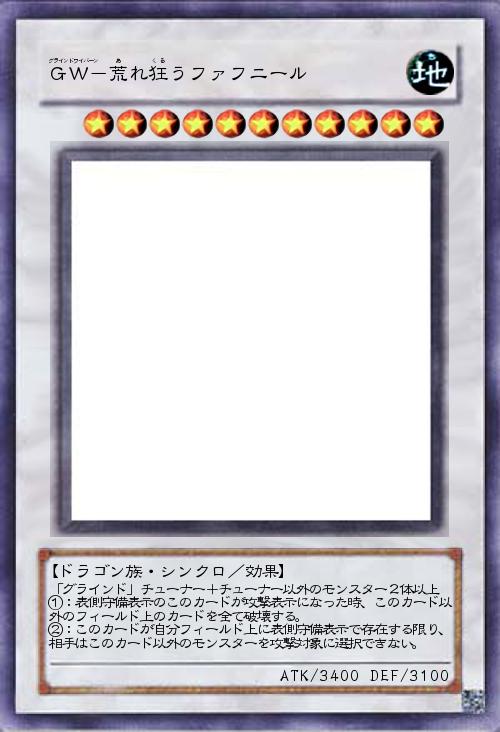 「グラインド」チューナー+チューナー以外のモンスター2体以上 ①:表側守備表示のこのカードが攻撃表示になった時、このカード以外のフィールド上のカードを全て破壊する。 ②:このカードが自分フィールド上に表側守備表示で存在する限り、相手はこのカード以外のモンスターを攻撃対象に選択できない。 |