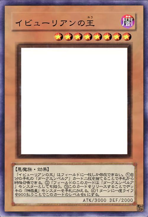 | 「イビューリアンの王」はフィールドに一枚しか存在できない。①自分の手札の「ダークエンペルア」カード二枚を捨てることで手札から特殊召喚できる。②「フィールドのこのカードは「ダークエンペルア」モンスターとしても扱う。③このカードをリリースすることでデッキの「神崇皇」モンスターを手札に加える。④1ターンに一度ライフを900払うことでこのカードのレベルを4にする。 | |||