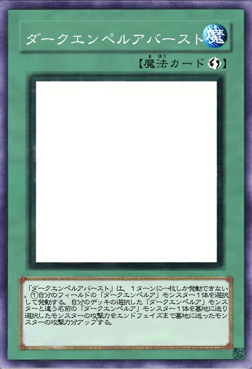 | 「ダークエンペルアバースト」は、1ターンに一枚しか発動できない。①自分のフィールドの「ダークエンペルア」モンスター1体を選択して発動する。自分のデッキの選択した「ダークエンペルア」モンスターと違う名前の「ダークエンペルア」モンスター1体を墓地に送り選択したモンスターの攻撃力をエンドフェイズまで墓地に送ったモンスターの攻撃力分アップする。 | |||
