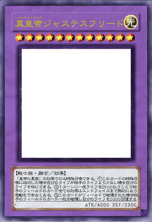 「ついに真皇帝登場。フリード・スター(フリード・コメット)とジャステックの真の姿。ライフを倍にできる驚異の効果をもちます。ライフを払えばタキオンみたいな効果も使えます。破壊された場合相手のフィールドのカード一枚を破壊しライフを回復できるモンスター。