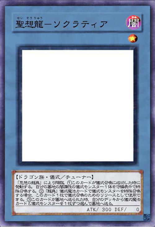 | 「思想の龍典」により降臨。①このカードが儀式召喚に成功した時に発動する。自分の墓地の闇属性の儀式モンスター1体を守備表示で特殊召喚する。②「龍典」儀式魔法カードで儀式モンスターを特殊召喚する場合、このカード1枚で儀式召喚のためのリリースとして使用できる。③このカードが墓地へ送られた時、自分のデッキから儀式魔法カードと儀式モンスターを1枚ずつ選んで墓地へ送る。 | |||