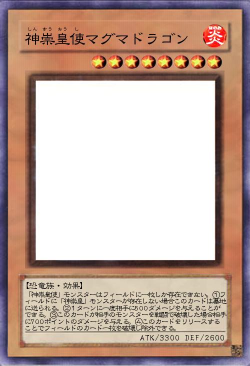 | 「神崇皇使」モンスターはフィールドに一枚しか存在できない。①フィールドに「神崇皇」モンスターが存在しない場合このカードは墓地に送られる。②1ターンに一度相手に500ダメージを与えることができる。③このカードが相手のモンスターを戦闘で破壊した場合相手に700ポイントのダメージを与える。④このカードをリリースすることでフィールドのカード一枚を破壊し除外できる。 | |||