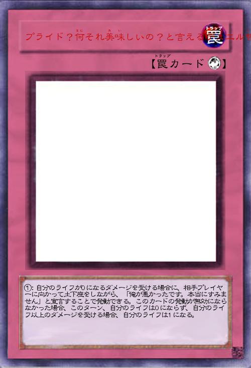 | ①:自分のライフが0になるダメージを受ける場合に、相手プレイヤーに向かって土下座をしながら、「俺が悪かったです。本当にすみません」と宣言することで発動できる。このカードの発動が無効にならなかった場合、このターン、自分のライフは0にならず、自分のライフ以上のダメージを受ける場合、自分のライフは1になる。 | |||
