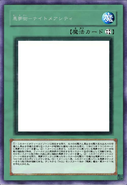| ①:このカードがフィールドゾーンに存在する限り、元々の攻撃力と異なる攻撃力または元々の守備力と異なる守備力を持つモンスターが破壊され墓地へ送られる度に、1体につき1つこのカードに悪夢カウンターを置く。②:1ターンに2度まで、このカードに乗っている悪夢カウンターを任意の個数取り除き、フィールド上に表側表示で存在するモンスター1体を対象として発動できる。そのモンスターに取り除いた数と同じ個数の悪夢カウンターを置く。③:このカードがフィールドゾーンに存在する限り、悪夢カウンターが乗ったモンスターの攻撃力・守備力は悪夢カウンター1つにつき250ポイントダウンする。④:1ターンに1度、このカードに乗っている悪夢カウンターを5つ取り除き発動できる。デッキから「NS」モンスター1体か「悪夢」魔法・罠カード1枚を手札に加える。 | |||