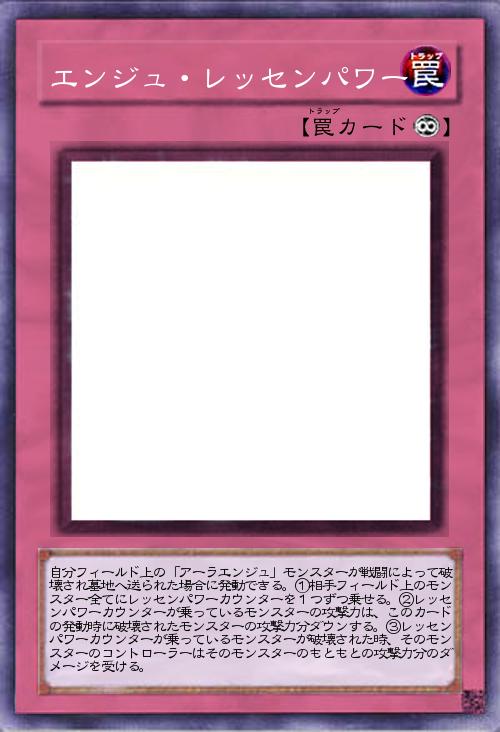 | 自分フィールド上の「アーラエンジュ」モンスターが戦闘によって破壊され墓地へ送られた場合に発動できる。①相手フィールド上のモンスター全てにレッセンパワーカウンターを1つずつ乗せる。②レッセンパワーカウンターが乗っているモンスターの攻撃力は、このカードの発動時に破壊されたモンスターの攻撃力分ダウンする。③レッセンパワーカウンターが乗っているモンスターが破壊された時、そのモンスターのコントローラーはそのモンスターのもともとの攻撃力分のダメージを受ける。 | |||