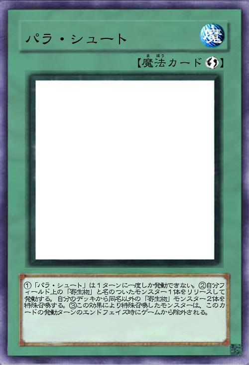 | ①「パラ・シュート」は1ターンに一度しか発動できない。②自分フィールド上の「寄生物」と名のついたモンスター1体をリリースして発動する。自分のデッキから同名以外の「寄生物」モンスター2体を特殊召喚する。③この効果により特殊召喚したモンスターは、このカードの発動ターンのエンドフェイズ時にゲームから除外される。 | |||