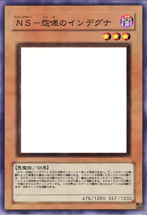 | 「NS-怨嗟のインデグナ」の②の効果は1ターンに1度しか使用できない。①:このカードが戦闘によって破壊され墓地へ送られた場合に発動できる。このカードを破壊したモンスターの攻撃力は、そのモンスターの元々の攻撃力分ダウンする。②:墓地に存在するこのカードを除外し、フィールド上に表側表示で存在するモンスター1体を対象として発動できる。そのモンスターの攻撃力・守備力を500ポイントダウンする。この効果はこのカードが墓地へ送られたターンには発動できず、相手ターンでも発動できる。 | |||