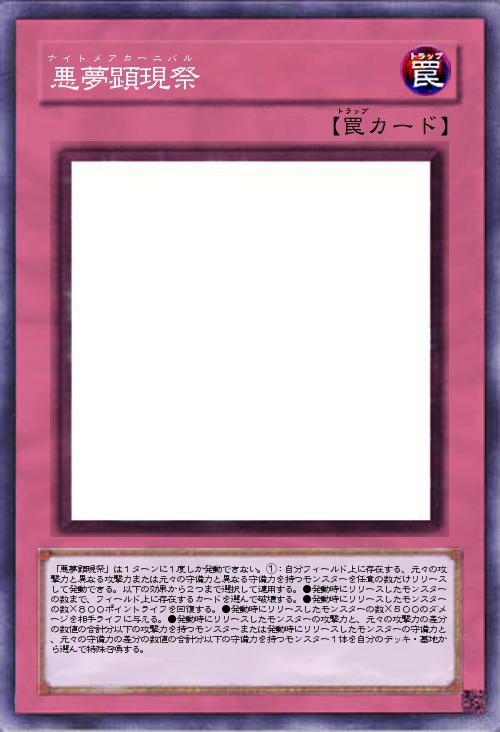 | 「悪夢顕現祭」は1ターンに1度しか発動できない。①:自分フィールド上に存在する、元々の攻撃力と異なる攻撃力または元々の守備力と異なる守備力を持つモンスターを任意の数だけリリースして発動できる。以下の効果から2つまで選択して適用する。●発動時にリリースしたモンスターの数まで、フィールド上に存在するカードを選んで破壊する。●発動時にリリースしたモンスターの数×800ポイントライフを回復する。●発動時にリリースしたモンスターの数×500のダメージを相手ライフに与える。●発動時にリリースしたモンスターの攻撃力と、元々の攻撃力の差分の数値の合計分以下の攻撃力を持つモンスターまたは発動時にリリースしたモンスターの守備力と、元々の守備力の差分の数値の合計分以下の守備力を持つモンスター1体を自分のデッキ・墓地から選んで特殊召喚する。 | |||
