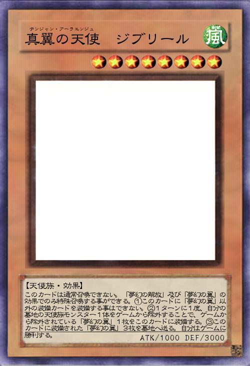 | このカードは通常召喚できない。「夢幻の解放」及び「夢幻の翼」の効果でのみ特殊召喚する事ができる。①このカードに「夢幻の翼」以外の装備カードを装備する事はできない。②1ターンに1度、自分の墓地の天使族モンスター1体をゲームから除外することで、ゲームから除外されている「夢幻の翼」1枚をこのカードに装備する。③このカードに装備された「夢幻の翼」3枚を墓地へ送る。自分はゲームに勝利する。 | |||
