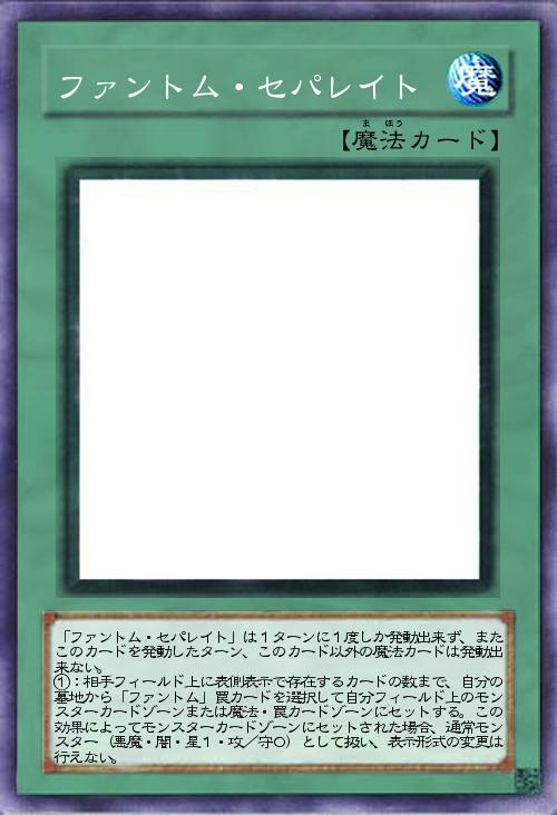 「ファントム・セパレイト」は1ターンに1度しか発動出来ず、またこのカードを発動したターン、このカード以外の魔法カードは発動出来ない。 ①:相手フィールド上に表側表示で存在するカードの数まで、自分の墓地から「ファントム」罠カードを選択して自分フィールド上のモンスターカードゾーンまたは魔法・罠カードゾーンにセットする。この効果によってモンスターカードゾーンにセットされた場合、通常モンスター(悪魔・闇・星1・攻/守0)として扱い、表示形式の変更は行えない。 |