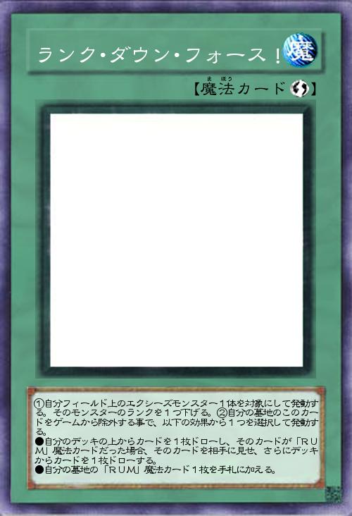 ①自分フィールド上のエクシーズモンスター1体を対象にして発動する。そのモンスターのランクを1つ下げる。②自分の墓地のこのカードをゲームから除外する事で、以下の効果から1つを選択して発動する。 ●自分のデッキの上からカードを1枚ドローし、そのカードが「RUM」魔法カードだった場合、そのカードを相手に見せ、さらにデッキからカードを1枚ドローする。 ●自分の墓地の「RUM」魔法カード1枚を手札に加える。 |