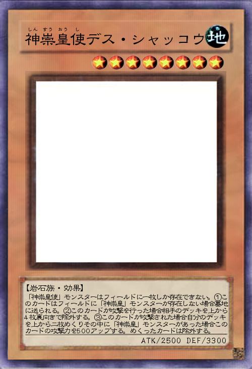 | 「神崇皇使」モンスターはフィールドに一枚しか存在できない。①このカードはフィールドに「神崇皇」モンスターが存在しない場合墓地に送られる。②このカードが攻撃を行った場合相手のデッキを上から4枚裏向きで除外する。③このカードが攻撃された場合自分のデッキを上から二枚めくりその中に「神崇皇」モンスターがあった場合このカードの攻撃力を500アップする。めくったカードは除外する。 | |||