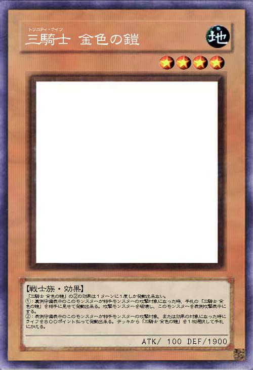 「三騎士 金色の鎧」の②の効果は1ターンに1度しか発動出来ない。 ①:裏側守備表示のこのモンスターが相手モンスターの攻撃対象になった時、手札の「三騎士 金色の鎧」を相手に見せて発動出来る。攻撃モンスターを破壊し、このモンスターを表側攻撃表示にする。 ②:表側守備表示のこのモンスターが相手モンスターの攻撃対象、または効果の対象になった時にライフを800ポイント払って発動出来る。デッキから「三騎士 金色の鎧」を1枚選択して手札に加える。 |