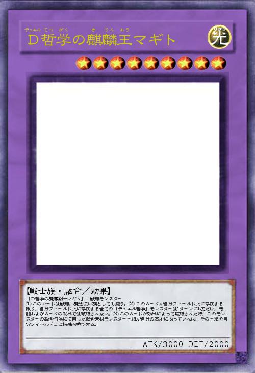 「D哲学の魔導剣士マギト」+獣族モンスター ①:このカードは獣族、魔法使い族としても扱う。②:このカードが自分フィールド上に存在する限り、自分フィールド上に存在する全ての「デュエル哲学」モンスターは1ターンに1度だけ、戦闘およびカードの効果では破壊されない。③:このカードが効果によって破壊された時、このモンスターの融合召喚に使用した融合素材モンスター一組が自分の墓地に揃っていれば、その一組を自分フィールド上に特殊召喚できる。 |