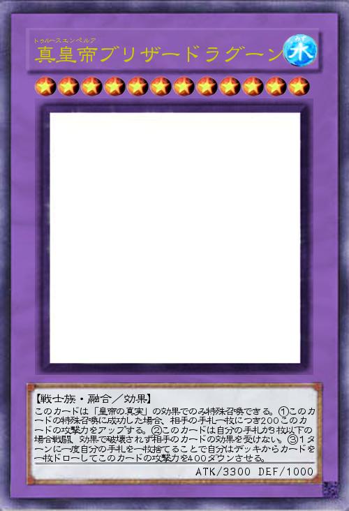 | このカードは「皇帝の真実」の効果でのみ特殊召喚できる。①このカードの特殊召喚に成功した場合、相手の手札一枚につき200このカードの攻撃力をアップする。②このカードは自分の手札が3枚以下の場合戦闘、効果で破壊されず相手のカードの効果を受けない。③1ターンに一度自分の手札を一枚捨てることで自分はデッキからカードを一枚ドローしてこのカードの攻撃力を400ダウンさせる。 | |||