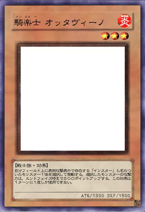 | 自分フィールド上に表側攻撃表示で存在する「インスター」と名のついたモンスター1体を選択して発動する。選択したモンスターの攻撃力は、エンドフェイズ時まで500ポイントアップする。この効果は1ターンに1度しか使用できない。 | |||