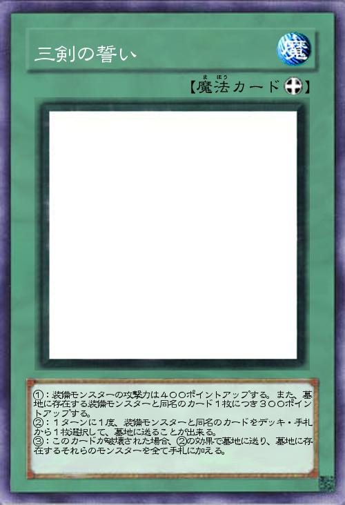①:装備モンスターの攻撃力は400ポイントアップする。また、墓地に存在する装備モンスターと同名のカード1枚につき300ポイントアップする。 ②:1ターンに1度、装備モンスターと同名のカードをデッキ・手札から1枚選択して、墓地に送ることが出来る。 ③:このカードが破壊された場合、②の効果で墓地に送り、墓地に存在するそれらのモンスターを全て手札に加える。 |