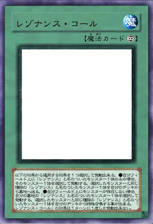 | 以下の効果から適用する効果を1つ選択して発動出来る。●自分フィールド上に「レゾナンス」と名のついたモンスター1体のみの場合、そのモンスター1体を選択して発動する。選択したモンスターと同じ種族の「レゾナンス」と名のついたモンスター1体を自分のデッキから墓地へ送る。●自分フィールド上にモンスターが存在しない場合、自分の墓地の「レゾナンス」と名のついたモンスター1体を選択して発動する。選択したモンスターと同じ種族の「レゾナンス」と名のついたモンスター1体を自分のデッキから特殊召喚する事が出来る。「レゾナンス・コール」の効果は1ターンに1度しか発動出来ない。 | |||
