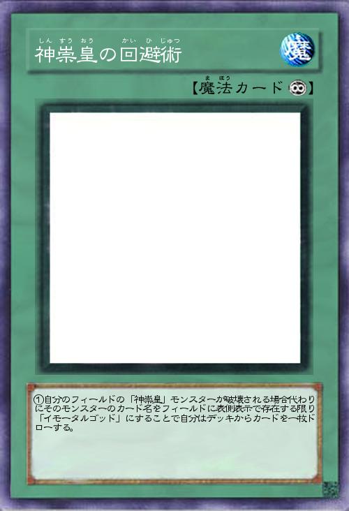 | ①自分のフィールドの「神崇皇」モンスターが破壊される場合代わりにそのモンスターのカード名をフィールドに表側表示で存在する限り「イモータルゴッド」にすることで自分はデッキからカードを一枚ドローする。 | |||