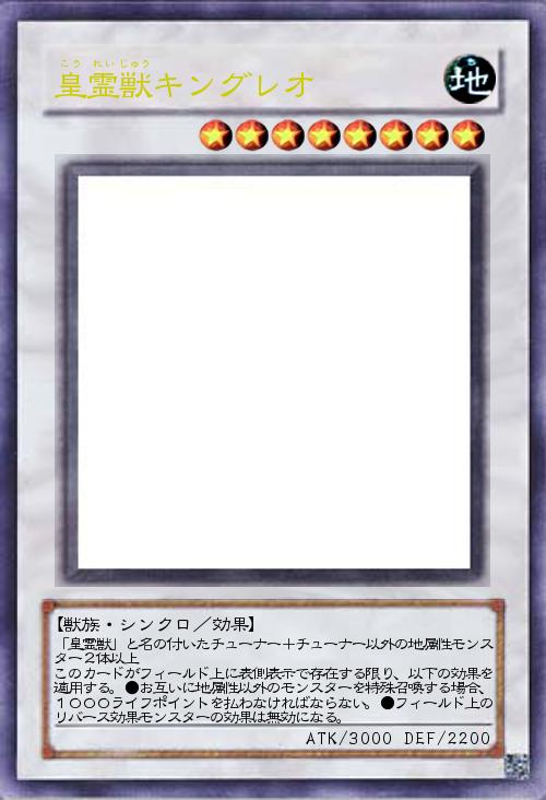 「皇霊獣」と名の付いたチューナー+チューナー以外の地属性モンスター2体以上 このカードがフィールド上に表側表示で存在する限り、以下の効果を適用する。●お互いに地属性以外のモンスターを特殊召喚する場合、1000ライフポイントを払わなければならない。●フィールド上のリバース効果モンスターの効果は無効になる。 |