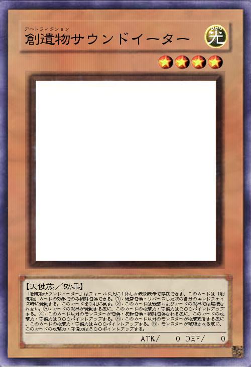 | 「創遺物サウンドイーター」はフィールド上に1体しか表側表示で存在できず、このカードは「創遺物」カードの効果でのみ特殊召喚できる。①:通常召喚・リバースした次の自分のエンドフェイズ時に発動する。このカードを手札に戻す。②:このカードは戦闘およびカードの効果では破壊されない。③:カードの効果が発動する度に、このカードの攻撃力・守備力は200ポイントアップする。④:このカード以外のモンスターが召喚・反転召喚・特殊召喚される度に、このカードの攻撃力・守備力は300ポイントアップする。⑤:このカード以外のモンスターが攻撃宣言する度に、このカードの攻撃力・守備力は400ポイントアップする。⑥:モンスターが破壊される度に、このカードの攻撃力・守備力は500ポイントアップする。 | |||