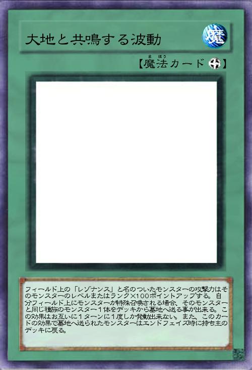 | フィールド上の「レゾナンス」と名のついたモンスターの攻撃力はそのモンスターのレベルまたはランク×100ポイントアップする。自分フィールド上にモンスターが特殊召喚される場合、そのモンスターと同じ種族のモンスター1体をデッキから墓地へ送る事が出来る。この効果はお互いに1ターンに1度しか発動出来ない。また、このカードの効果で墓地へ送られたモンスターはエンドフェイズ時に持ち主のデッキに戻る。 | |||