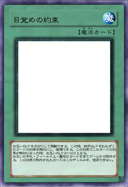 お互いのLPを半分にして発動できる。この時、相手はLPを払わずこのカードの効果を無効にし、破壊できる。この効果でこのカードの効果が無効になった時、お互いのLPは1000となる。 お互いの手札・フィールド上・墓地のカードを全てゲームから除外する。この効果て除外されたカードはこのデュエル中、使用できない。 |