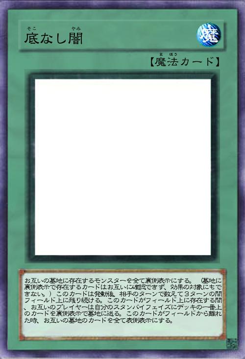 | お互いの墓地に存在するモンスターを全て裏側表示にする。(墓地に裏側表示で存在するカードはお互いに確認できず、効果の対象にもできない。)このカードは発動後、相手のターンで数えて3ターンの間フィールド上に残り続ける。このカードがフィールド上に存在する間、お互いのプレイヤーは自分のスタンバイフェイズにデッキの一番上のカードを裏側表示で墓地に送る。このカードがフィールドから離れた時、お互いの墓地のカードを全て表側表示にする。 | |||