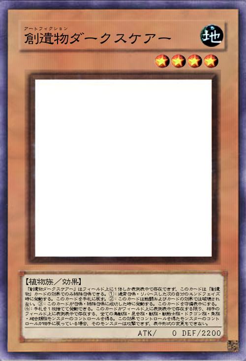 | 「創遺物ダークスケアー」はフィールド上に1体しか表側表示で存在できず、このカードは「創遺物」カードの効果でのみ特殊召喚できる。①:通常召喚・リバースした次の自分のエンドフェイズ時に発動する。このカードを手札に戻す。②:このカードは戦闘およびカードの効果では破壊されない。③:このカードが召喚・特殊召喚に成功した時に発動する。このカードを守備表示にする。④:手札を1枚捨てて発動できる。このカードがフィールド上に表側表示で存在する限り、相手のフィールド上に表側表示で存在する、全ての鳥獣族・昆虫族・獣族・獣戦士族・ドラゴン族・魚族・爬虫類族モンスターのコントロールを得る。この効果でコントロールを得たモンスターのコントロールが相手に戻っている場合、そのモンスターは攻撃できず、表示形式の変更もできない。 | |||