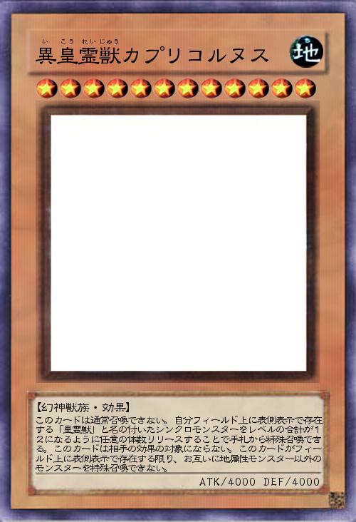 | このカードは通常召喚できない。自分フィールド上に表側表示で存在する「皇霊獣」と名の付いたシンクロモンスターをレベルの合計が12になるように任意の体数リリースすることで手札から特殊召喚できる。このカードは相手の効果の対象にならない。このカードがフィールド上に表側表示で存在する限り、お互いに地属性モンスター以外のモンスターを特殊召喚できない。 | |||