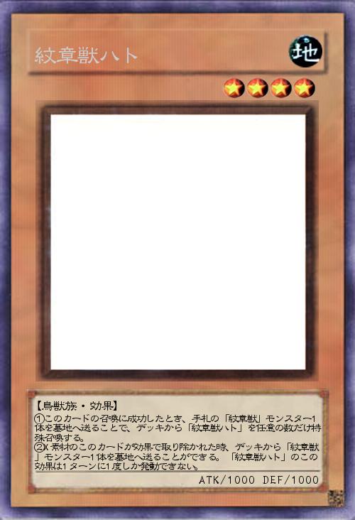 ①このカードの召喚に成功したとき、手札の「紋章獣」モンスター1体を墓地へ送ることで、デッキから「紋章獣ハト」を任意の数だけ特殊召喚する。 ②X素材のこのカードが効果で取り除かれた時、デッキから「紋章獣」モンスター1体を墓地へ送ることができる。「紋章獣ハト」のこの効果は1ターンに1度しか発動できない。 |