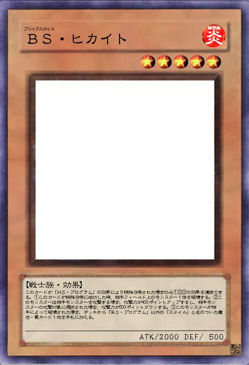 | このカードが「MS・プログラム」の効果により特殊召喚された場合のみ①②③の効果を適用できる。①このカードが特殊召喚に成功した時、相手フィールド上のモンスター1体を破壊する。②このモンスターは相手モンスターを攻撃する場合、攻撃力が400ポイントアップするし、相手モンスターの攻撃対象に選択された場合、攻撃力が600ポイントダウンする。③このモンスターが相手によって破壊された場合、デッキから「BS・プログラム」以外の「スタイル」と名のついた魔法・罠カード1枚を手札に加える。 | |||