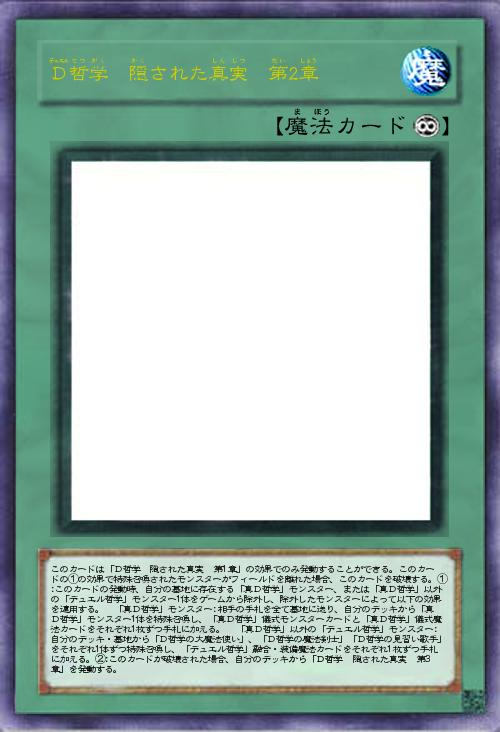 | このカードは「D哲学 隠された真実 第1章」の効果でのみ発動することができる。このカードの①の効果で特殊召喚されたモンスターがフィールドを離れた場合、このカードを破壊する。①:このカードの発動時、自分の墓地に存在する「真D哲学」モンスター、または「真D哲学」以外の「デュエル哲学」モンスター1体をゲームから除外し、除外したモンスターによって以下の効果を適用する。⚫︎「真D哲学」モンスター:相手の手札を全て墓地に送り、自分のデッキから「真D哲学」モンスター1体を特殊召喚し、「真D哲学」儀式モンスターカードと「真D哲学」儀式魔法カードをそれぞれ1枚ずつ手札に加える。⚫︎「真D哲学」以外の「デュエル哲学」モンスター:自分のデッキ・墓地から「D哲学の大魔法使い」、「D哲学の魔法剣士」「D哲学の見習い歌手」をそれぞれ1体ずつ特殊召喚し、「デュエル哲学」融合・装備魔法カードをそれぞれ1枚ずつ手札に加 | |||