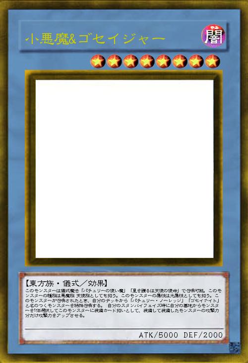 | このモンスターは儀式魔法「パチュリーの使い魔」「星を護るは天使の使命」で召喚可能。このモンスターの種族は悪魔族 天使族としても扱う。このモンスターの属性は光属性としても扱う。このモンスターが召喚されたとき、自分のデッキから「パチュリー・ノーレッジ」「ゴセイナイト」と名のつくモンスターを特殊召喚する。 自分のスタンバイフェイズ時に自分の墓地からモンスターを1体選択してこのモンスターに装備カード扱いとして、装備して装備したモンスターの攻撃力分だけ攻撃力をアップさせる。 | |||