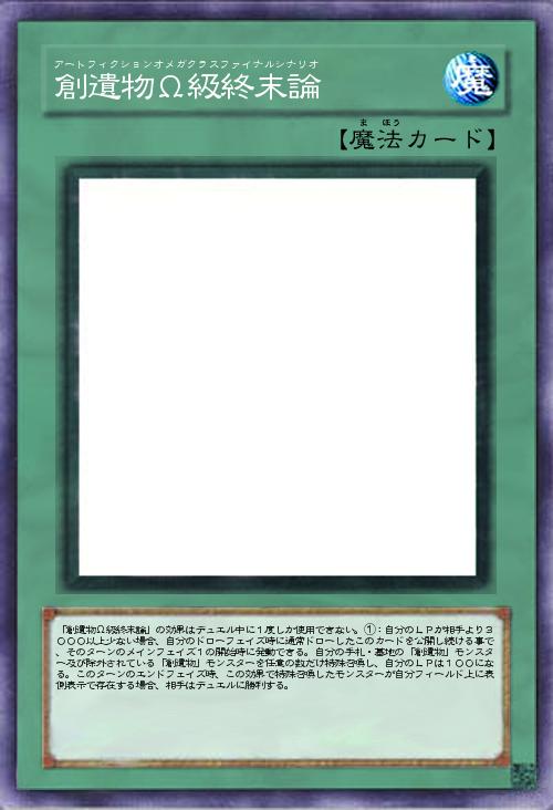 | 「創遺物Ω級終末論」の効果はデュエル中に1度しか使用できない。①:自分のLPが相手より3000以上少ない場合、自分のドローフェイズ時に通常ドローしたこのカードを公開し続ける事で、そのターンのメインフェイズ1の開始時に発動できる。自分の手札・墓地の「創遺物」モンスター及び除外されている「創遺物」モンスターを任意の数だけ特殊召喚し、自分のLPは100になる。このターンのエンドフェイズ時、この効果で特殊召喚したモンスターが自分フィールド上に表側表示で存在する場合、相手はデュエルに勝利する。 | |||