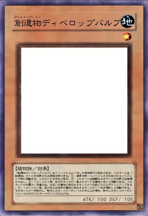 | 「創遺物ディベロップバルブ」はフィールド上に1体しか表側表示で存在できず、このカードは「創遺物」カードの効果でのみ特殊召喚できる。①:通常召喚・リバースした次の自分のエンドフェイズ時に発動する。このカードを手札に戻す。②:このカードは戦闘およびカードの効果では破壊されない。③:1ターンに1度、自分のデッキの一番上のカードを墓地へ送って発動できる。このカードの攻撃力・守備力は、お互いの墓地に存在するモンスターの数×300ポイントアップする。④:1ターンに1度、自分または相手の墓地に存在するモンスター1体を選択して発動できる。そのモンスターを除外し、除外したモンスターのレベルが5以上の場合、除外したモンスターのレベル-4分だけこのカードのレベルが上がる。 | |||