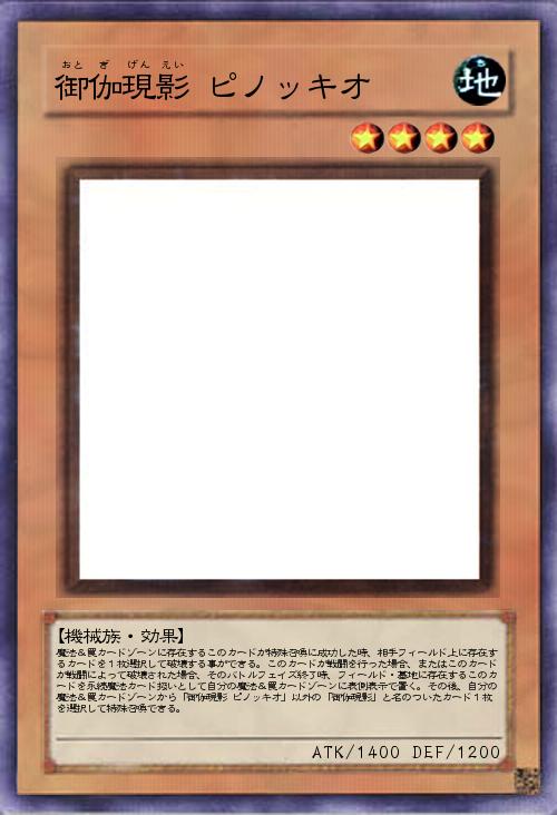 | 魔法&罠カードゾーンに存在するこのカードが特殊召喚に成功した時、相手フィールド上に存在するカードを1枚選択して破壊する事ができる。このカードが戦闘を行った場合、またはこのカードが戦闘によって破壊された場合、そのバトルフェイズ終了時、フィールド・墓地に存在するこのカードを永続魔法カード扱いとして自分の魔法&罠カードゾーンに表側表示で置く。その後、自分の魔法&罠カードゾーンから「御伽現影 ピノッキオ」以外の「御伽現影」と名のついたカード1枚を選択して特殊召喚できる。 | |||
