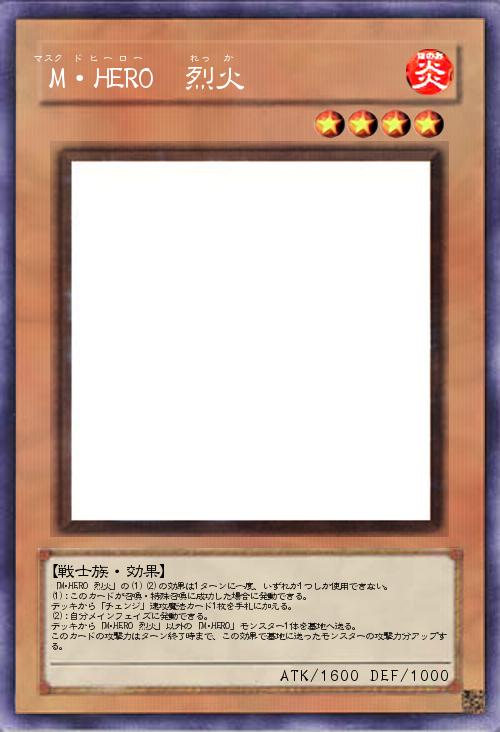 「M・HERO 烈火」の(1)(2)の効果は1ターンに一度、いずれか1つしか使用できない。 (1):このカードが召喚・特殊召喚に成功した場合に発動できる。 デッキから「チェンジ」速攻魔法カード1枚を手札に加える。 (2):自分メインフェイズに発動できる。 デッキから「M・HERO 烈火」以外の「M・HERO」モンスター1体を墓地へ送る。 このカードの攻撃力はターン終了時まで、この効果で墓地に送ったモンスターの攻撃力分アップする。 |
