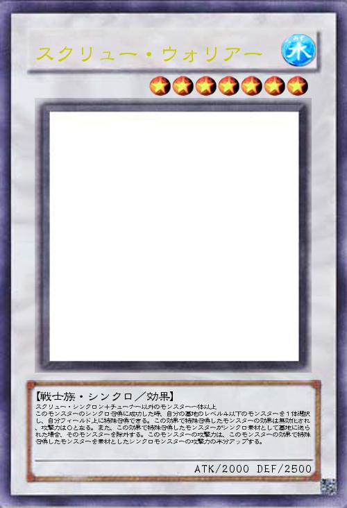 スクリュー・シンクロン+チューナー以外のモンスター一体以上 このモンスターのシンクロ召喚に成功した時、自分の墓地のレベル4以下のモンスターを1体選択し、自分フィールド上に特殊召喚できる。この効果で特殊召喚したモンスターの効果は無効化され、攻撃力は0となる。また、この効果で特殊召喚したモンスターがシンクロ素材として墓地に送られた場合、そのモンスターを除外する。このモンスターの攻撃力は、このモンスターの効果で特殊召喚したモンスターを素材としたシンクロモンスターの攻撃力の半分アップする。 |