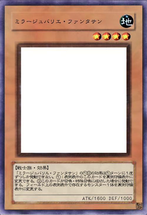| 「ミラージュバリエ・ファンタサン」の①②の効果は①ターンに1度ずつしか発動できない。①:表側表示のこのカードを裏側守備表示に変更できる。②このカードが召喚・特殊召喚に成功した場合に発動できる。フィールド上の表側表示で存在するモンスター1体を裏側守備表示に変更する。 | |||
