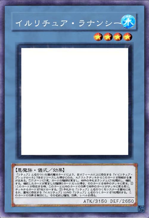 | 「リチュア」と名のついた儀式魔法カードにより、自分フィールド上に存在する「イビリチュア・プシュケローネ」1体をリリースした場合にのみ、エクストラデッキからこのカードを降臨する事が出来る。①:1ターンに1度、カードの種類を宣言し、相手の手札をランダムに1枚選択し、確認する。確認したカードが宣言した種類のカードだった場合、そのカードを相手のデッキに戻す。②:このカードが存在する時、このカード以外のカードの効果で相手のカードがデッキに戻る度に、デッキからカードを1枚ドローする。③:手札から「リチュア」と名のつくモンスターを墓地に送るか、墓地に存在する「イルリチュア」以外の「リチュア」と名のつくカードを1枚選択する。このカードの効果を無効にし、その名前と種族、効果、レベルを得る。 | |||