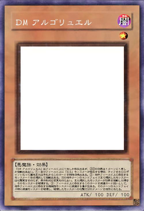 | 「DM アルゴリュエル」はフィールド上に1枚しか存在出来ず、②③の効果は1ターンに1度しか発動出来ない。①:自分フィールド上に「SS」モンスターが存在する場合、ライフを800ポイント払って墓地または手札からこのカードを特殊召喚出来る。②:相手フィールド上に存在するモンスター1体を選択して発動出来る。次の相手ターンのエンドフェイズまで選択したモンスターは攻撃宣言を行えず、表示形式の変更も行えない。また選択したモンスターが効果を発動した場合、そのモンスターを破壊する。③:フィールド上に存在するこのカードを装備カード扱いとして、相手フィールド上に存在する機械族モンスターに装備する事が出来る。そのターンのエンドフェイズ時に装備モンスターを破壊し、破壊したモンスターの攻撃力分のダメージを相手に与える。 | |||