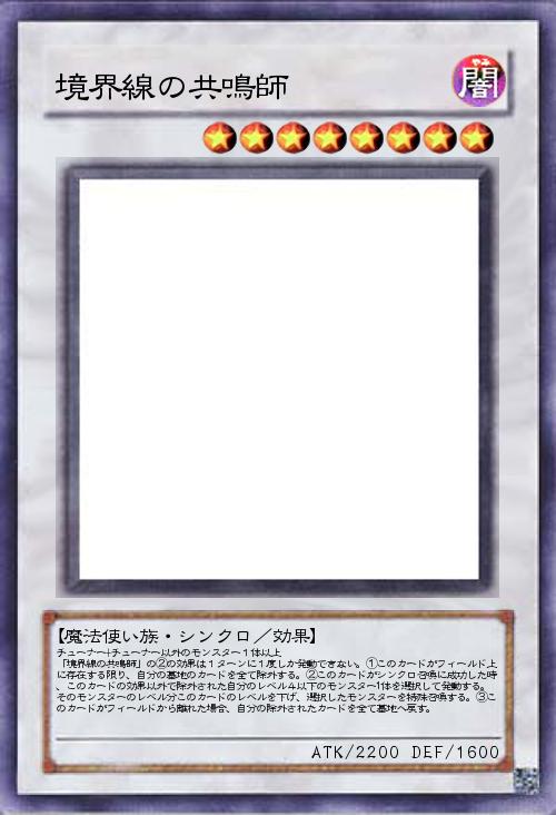 チューナー+チューナー以外のモンスター1体以上 「境界線の共鳴師」の②の効果は1ターンに1度しか発動できない。①このカードがフィールド上に存在する限り、自分の墓地のカードを全て除外する。②このカードがシンクロ召喚に成功した時、このカードの効果以外で除外された自分のレベル4以下のモンスター1体を選択して発動する。そのモンスターのレベル分このカードのレベルを下げ、選択したモンスターを特殊召喚する。③このカードがフィールドから離れた場合、自分の除外されたカードを全て墓地へ戻す。 |