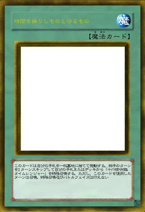 | このカードは自分の手札を一枚墓地に捨てて発動する。相手のターンを2ターンスキップして自分の手札またはデッキから「十六夜咲夜&タイムレンジャー」を特殊召喚する。ただし、このカードを使用したターンは召喚、特殊召喚及びバトルフェイズは行えない | |||