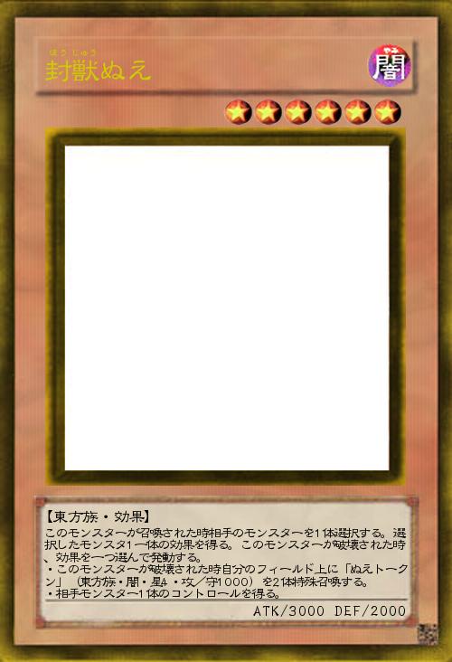 このモンスターが召喚された時相手のモンスターを1体選択する。選択したモンスタ1一体の効果を得る。このモンスターが破壊された時、効果を一つ選んで発動する。 ・このモンスターが破壊された時自分のフィールド上に「ぬえトークン」(東方族・闇・星4・攻/守1000)を2体特殊召喚する。 ・相手モンスター1体のコントロールを得る。 |