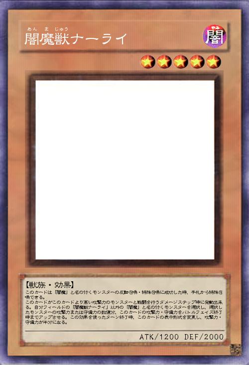 このカードは「闇魔」と名の付くモンスターの反転召喚・特殊召喚に成功した時、手札から特殊召喚できる。 このカードがこのカードより高い攻撃力のモンスターと戦闘を行うダメージステップ時に発動出来る。自分フィールドの「闇魔獣ナーライ」以外の「闇魔」と名の付くモンスターを選択し、選択したモンスターの攻撃力または守備力の数値分、このカードの攻撃力・守備力をバトルフェイズ終了時までアップさせる。この効果を使ったターン終了時、このカードの表示形式を変更し、攻撃力・守備力が半分になる。 |